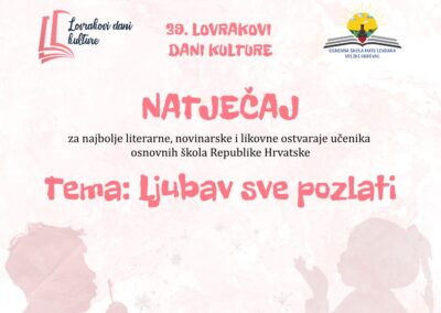 S ponosom objavljujemo kako je na natječaju povodom 39. Lovrakovih dana kulture za najbolje literarne, novinarske i likovne radove učenika osnovnih škola Republike Hrvatske, na temu „Ljubav sve pozlati“, nagrađen literarni rad učenika 4.b razreda Ivana Ćorića.